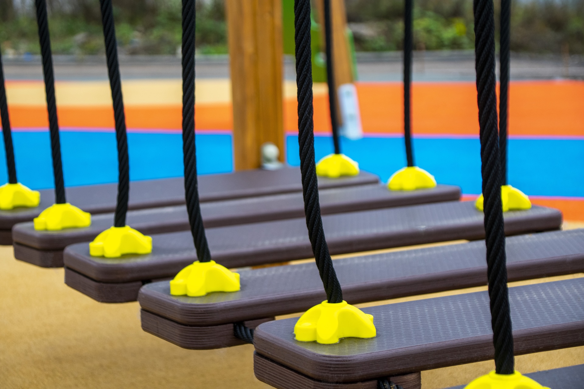 - Игровое оборудование для разных возможностей. На площадке должны присутствовать элементы, которые могут использовать дети с различными ограничениями: качели с фиксирующими ремнями, низкие горки с поручнями, сенсорные панели, тактильные игры и игровые стенды для развития моторики и сенсорных навыков.