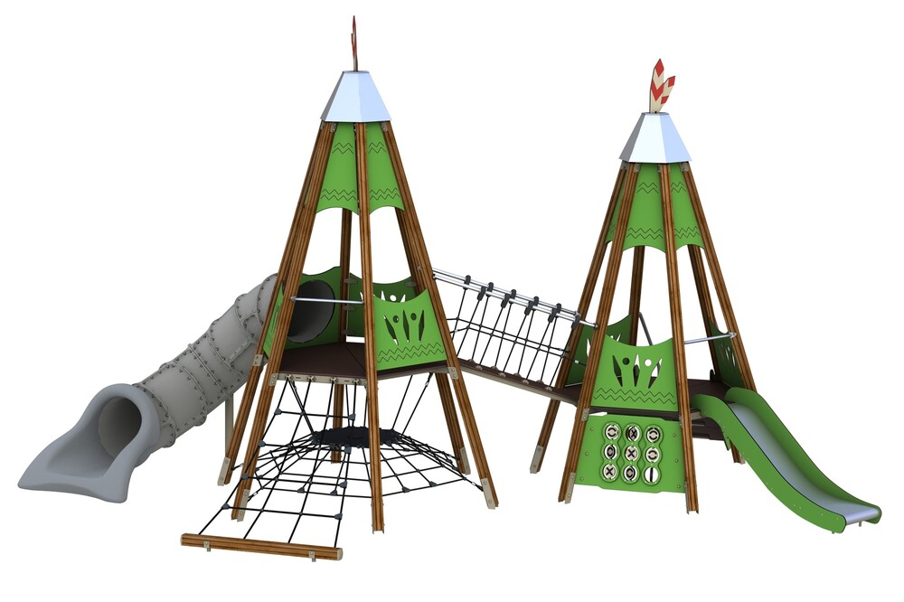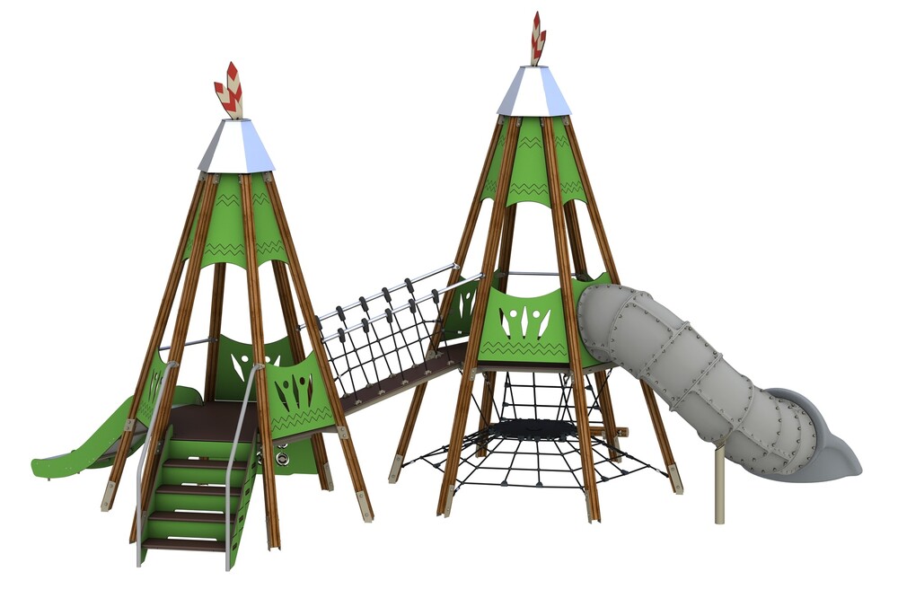 горка-тоннель , заглушки , клееный брус , краска , ламинированная ФСФ фанера , металл , нержавеющая сталь , оцинкованный крепеж , ФСФ фанера , HPL , канатная сетка