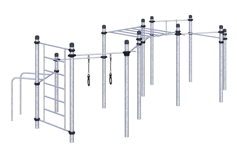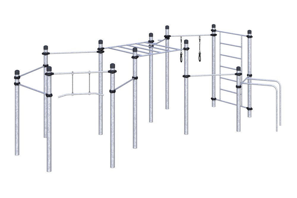 Четыре разноуровневых турника классического хвата, шведская стенка и упор для отжимания.