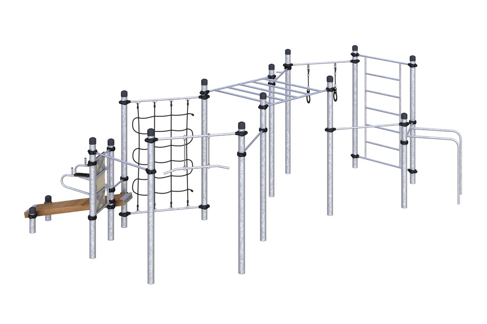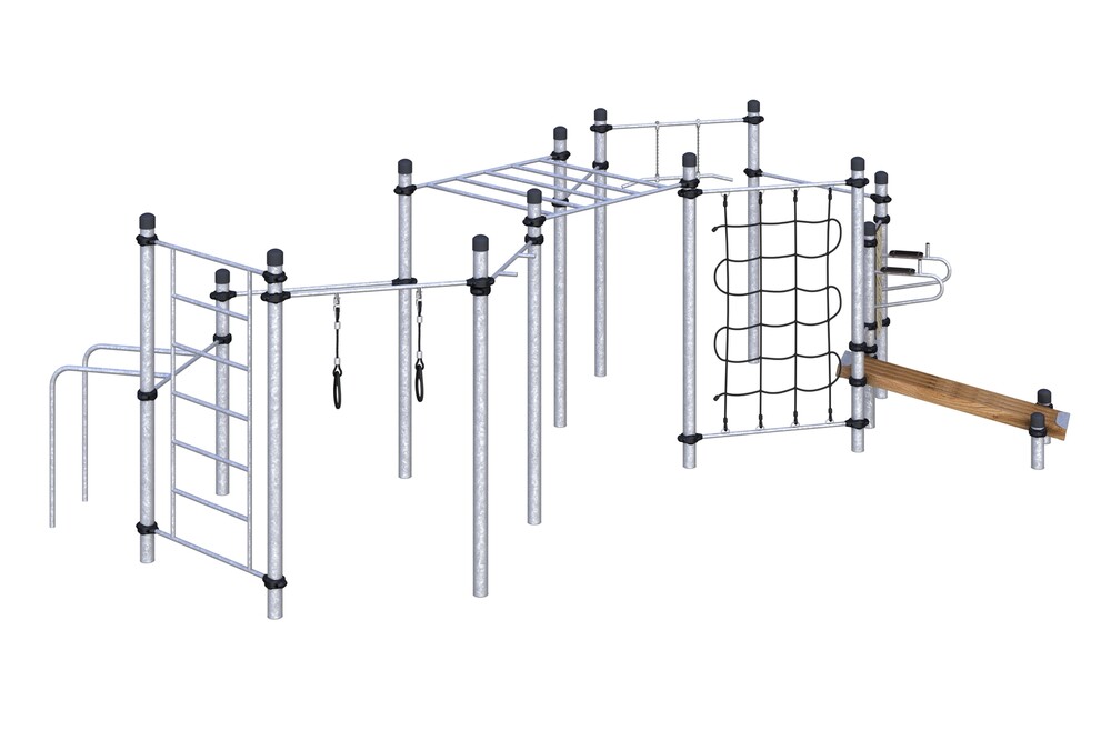 Три разноуровневых турника классического хвата, турник хватом "молоток", шведская стенка, классический рукоход, брусья для отжиманий, гимнастические кольца, гимнастическая перекладина, вертикальная стойка и наклонная лавка для упражнений на пресс, канатная сетка.