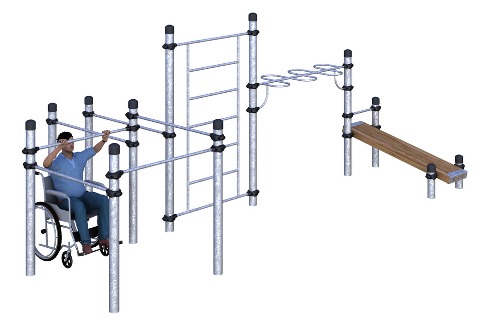 Четыре турника классического хвата, брусья, шведская стенка, рукоход "змейка", наклонная скамейка для упражнений на пресс. Данный WORKOUT подходит для занятий людям в инвалидных креслах.